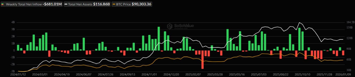 - З 5 по 9 січня спотові біткоїн-ETF зафіксували відтік капіталу на $681 млн.